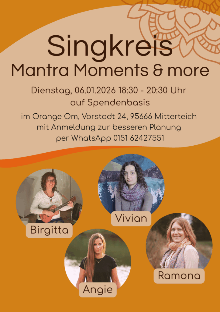 Auch zusätzliche Klänge und Instrumente sind willkommen – ob Harmonium, Gitarre, Trommeln, Rasseln oder Klangschalen, alles, was den Kreis bereichert, darf mitgebracht werden.