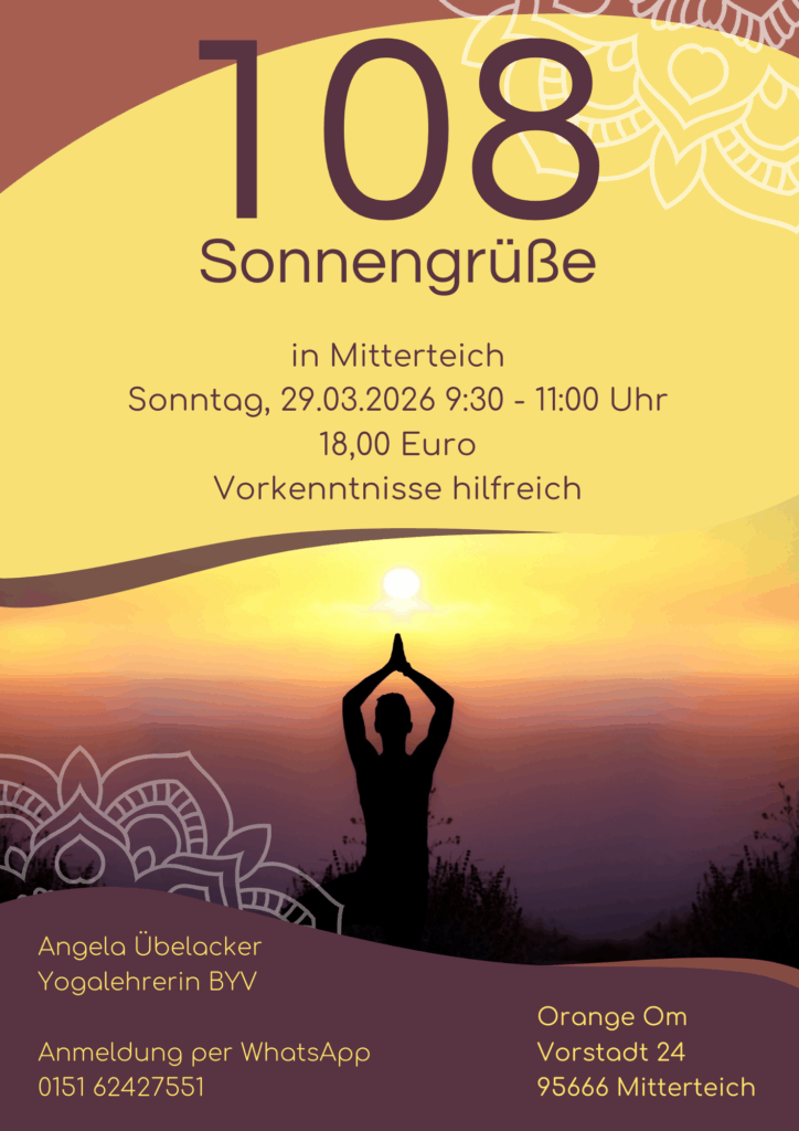 Tauche ein in die kraftvolle Praxis der 108 Sonnengrüße (Surya Namaskar) – eine bewegte Meditation, die Körper, Geist und Herz in Einklang bringt. In einem geschützten Raum, frei von äußeren Ablenkungen, entsteht eine besondere Atmosphäre der Konzentration, Stille und inneren Verbindung.