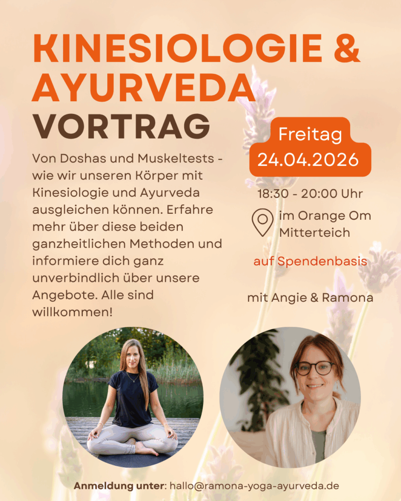 Den Körper ganzheitlich unterstützen, das ist die große gemeinsame Leidenschaft von mir und Ramona im Orange Om. Da wir nicht nur Yogastudio, sondern auch ein Raum für Gesundheit sind, möchten wir euch Einblicke in unsere weiteren Standbeine Ayurveda und Kinesiologie geben. Erfahre in diesem Vortrag, wie die beiden Methoden funktionieren und ob sie dir persönlich helfen können.